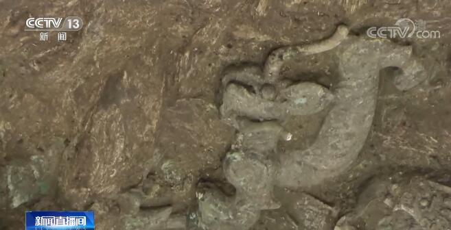 三星堆遗址祭祀区考古工作队 赵昊:有点像1号神树上面有一条龙是从神树上面向下,从天而降的那个时候身体是朝上的。我们现在推测这个器物并不是全部的部分,而只是一个更大器物的一个基座或者底部的部分。