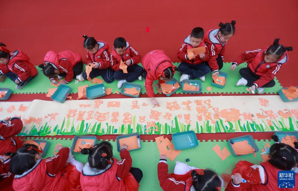 12月27日,在重庆市北碚区朝阳幼儿园,孩子们在体验剪纸。