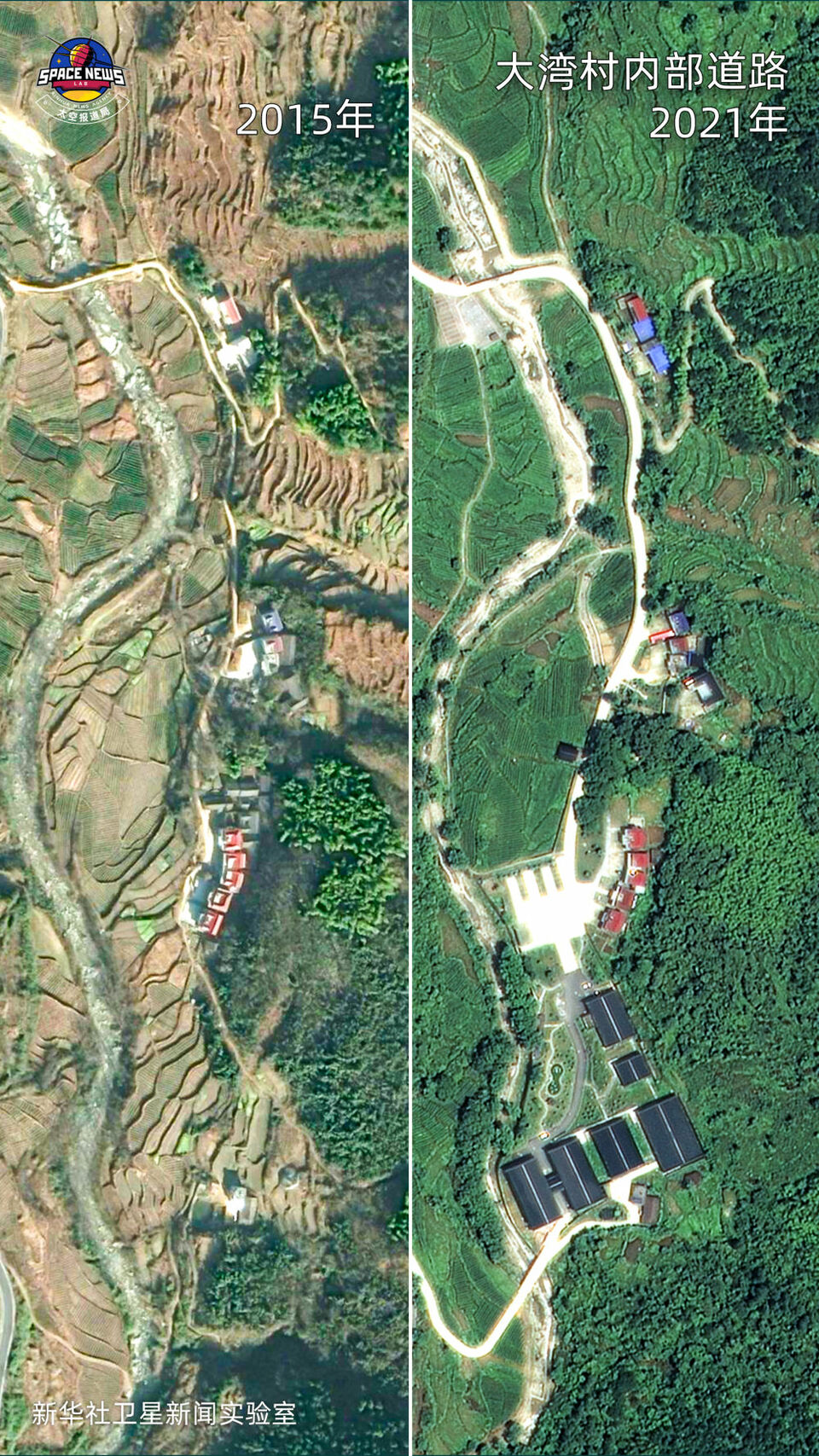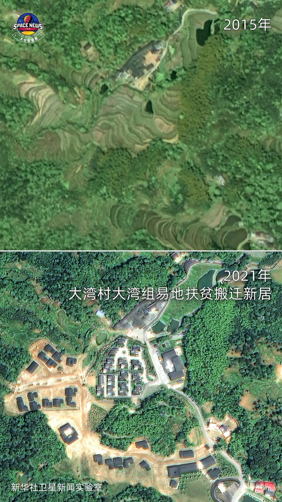 卫星见证了易地扶贫搬迁新居“从无到有”。大湾村共建设4个易地扶贫搬迁新居点,搬迁群众129户439人。