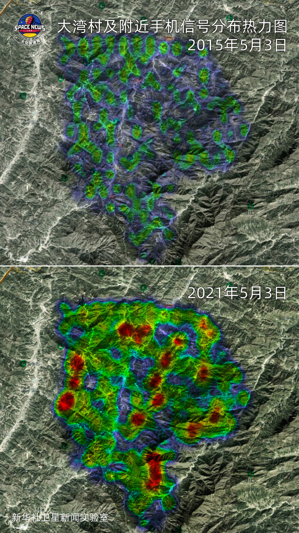 有色区域代表手机信号,信号密度越大,颜色越深。与2015年相比,更大范围、更密集的手机信号,反映出大别山区大幅增长的人流量。