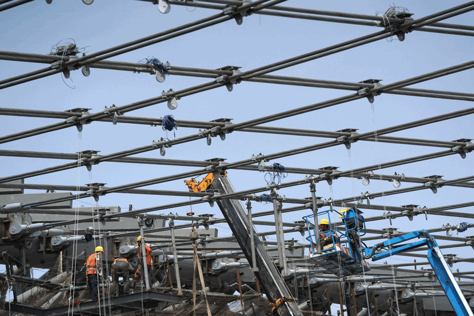 国家速滑馆屋面索网结构采用国产高钒封闭索,索网结构平面投影尺寸约198×124米,是世界最大的索网体育馆屋面。研发首创了复杂张力结构综合形态分析方法,用钢量约为传统屋顶的1/4。