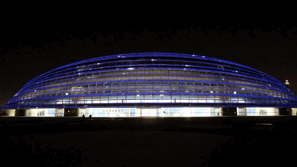 国家速滑馆玻璃幕墙外有22条高低盘旋、似环绕飘舞的“冰丝带”,内部集成的夜景照明系统开启后,丝带曼舞、轻盈跃动、异彩纷呈,展现了速度滑冰运动的速度与激情。