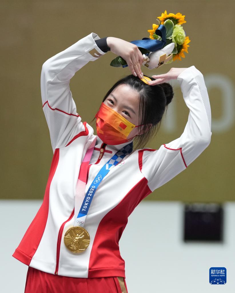 7月24日,杨倩在东京奥运会射击女子10米气步枪颁奖仪式上“比心”。新华社记者 鞠焕宗 摄