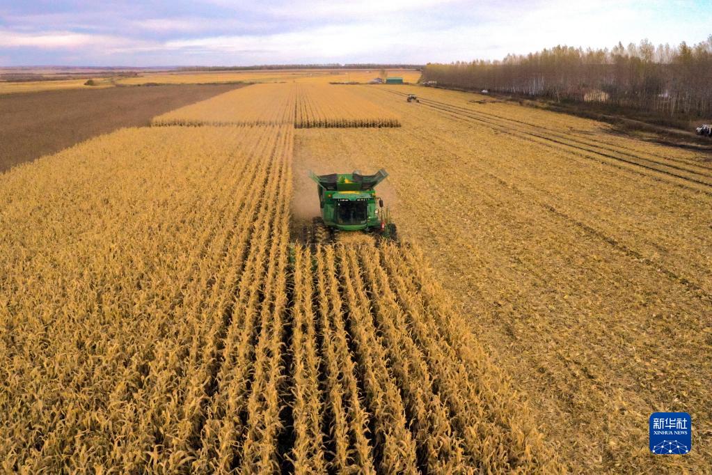 这是10月7日拍摄的黑龙江省绥化市北林区玉米收割现场(无人机照片)。新华社发(杨明辉 摄)