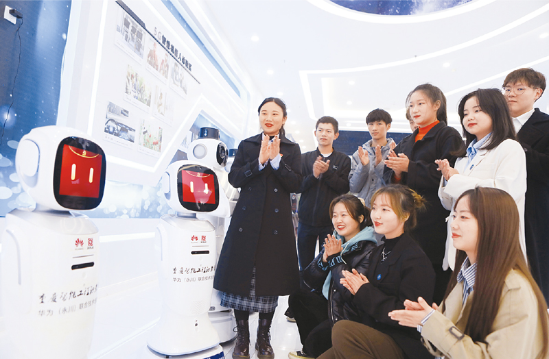 2021年11月13日,重庆智能工程职业学院校园内,智能机器人“大华”、“大智”向学生们普及党的十九届六中全会精神,其可爱的形象和声音,深受学生们的喜爱。 人民图片 陈仕川/摄