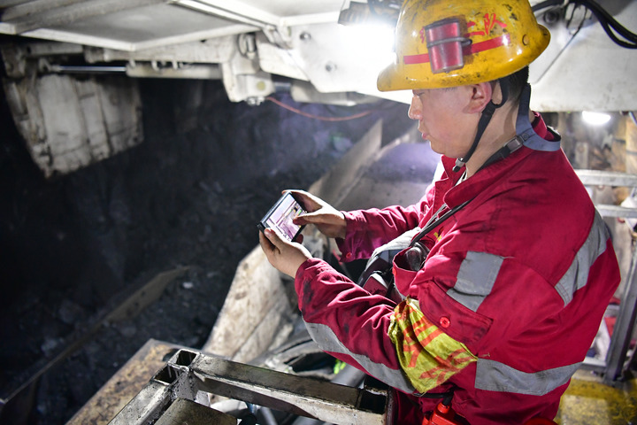 在曹家滩智慧矿山智能化工作面内,综采二队机电副队长蔡进通过操作手机控制生产设备。新华社记者邵瑞 摄