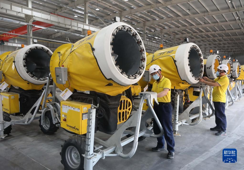 这是张家口高新区冰雪运动装备产业园内一家冰雪设备企业的工人在车间查验造雪机质量(2021年6月23日摄)。新华社记者 杨世尧 摄