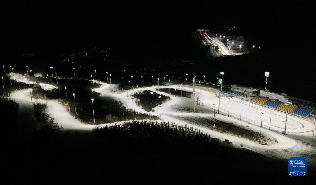 这是张家口赛区国家越野滑雪中心(下)与国家跳台滑雪中心(上)夜景(2021年2月30日无人机照片)。新华社记者 杨世尧 摄
