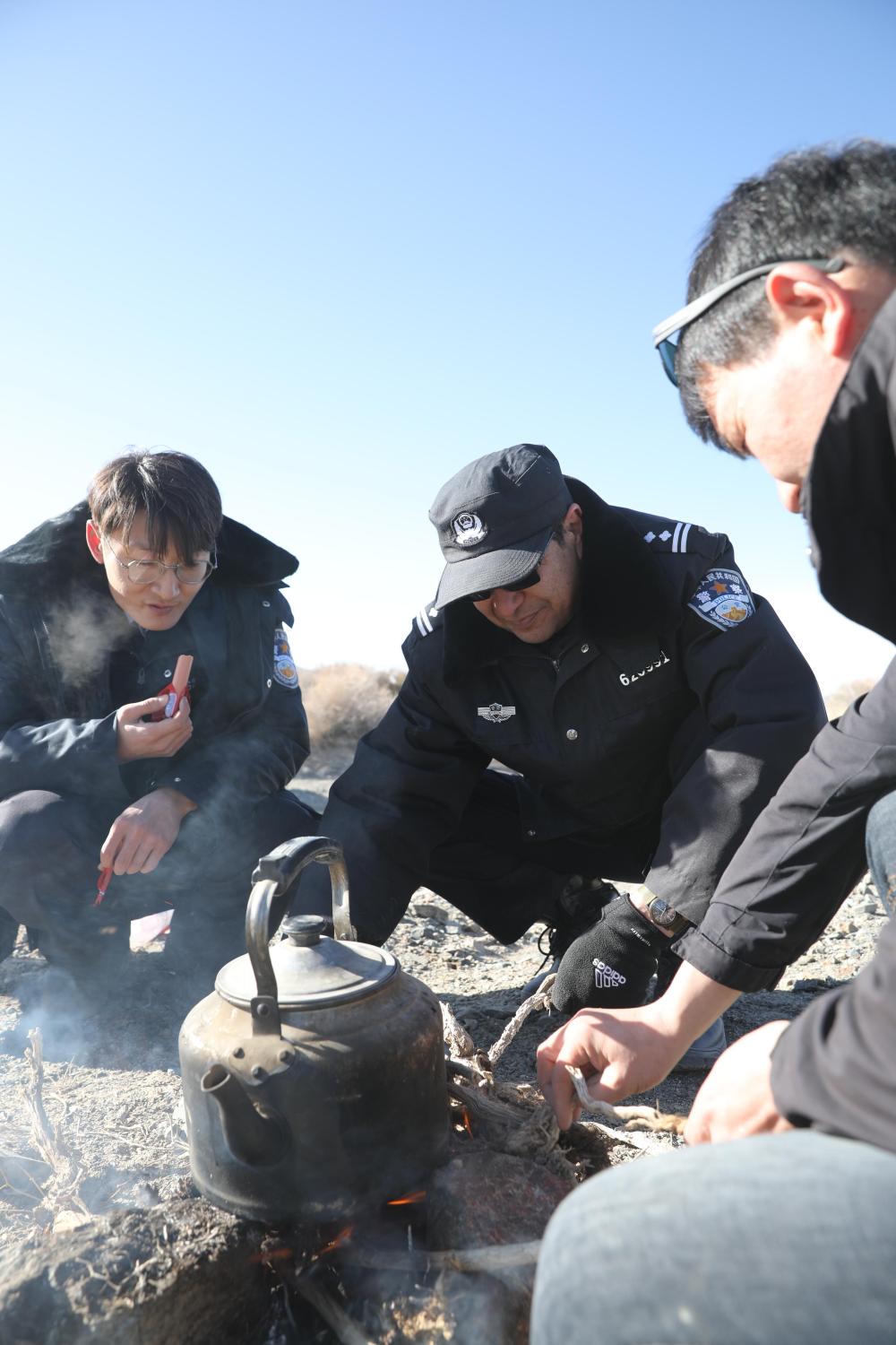 ↑甘肃省公安厅森林公安局安南坝分局民警在甘肃安南坝野骆驼国家级自然保护区巡逻途中烧水(2021年1月8日摄)。
