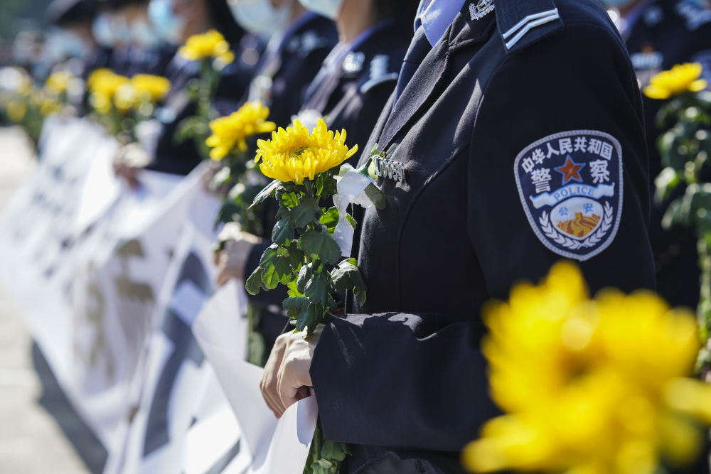 ↑ 在云南省西双版纳傣族自治州景洪市,民警在参加缉毒警察蔡晓东遗体送别仪式(2021年12月8日摄)。