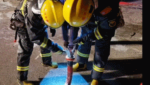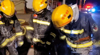 消防员不得不用锤子将水带上厚厚的冰壳凿碎