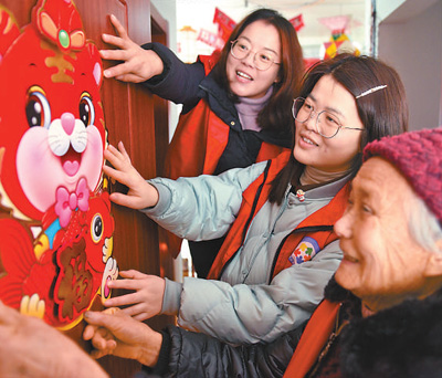 近日,安徽省当涂县五彩社会工作服务中心的志愿者与空巢老人一起贴年画,为老人家增添节日喜庆气氛。