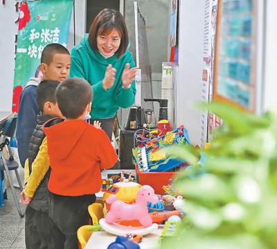 在福建省福州市晋安区鼓山镇“村童妈妈聚乐部”志愿服务站,志愿者张洁在教小朋友唱歌。