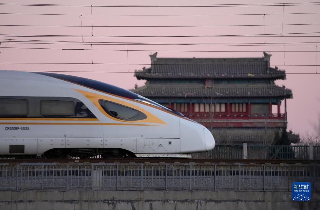 1月17日清晨,一列动车组列车驶过北京永定门城楼。