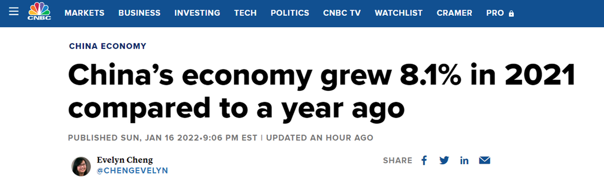 美国CNBC网站1月17日报道称,中国国家统计局发布的数据显示,初步核算,2021全年国内生产总值1143670亿元,按不变价格计算,比上年增长8.1%。