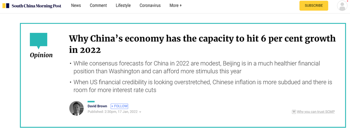 香港《南华早报》评论认为,中国的金融状况要比美国健康得多,政策空间很大。中国经济有能力在 2022 年实现 6% 的增长。