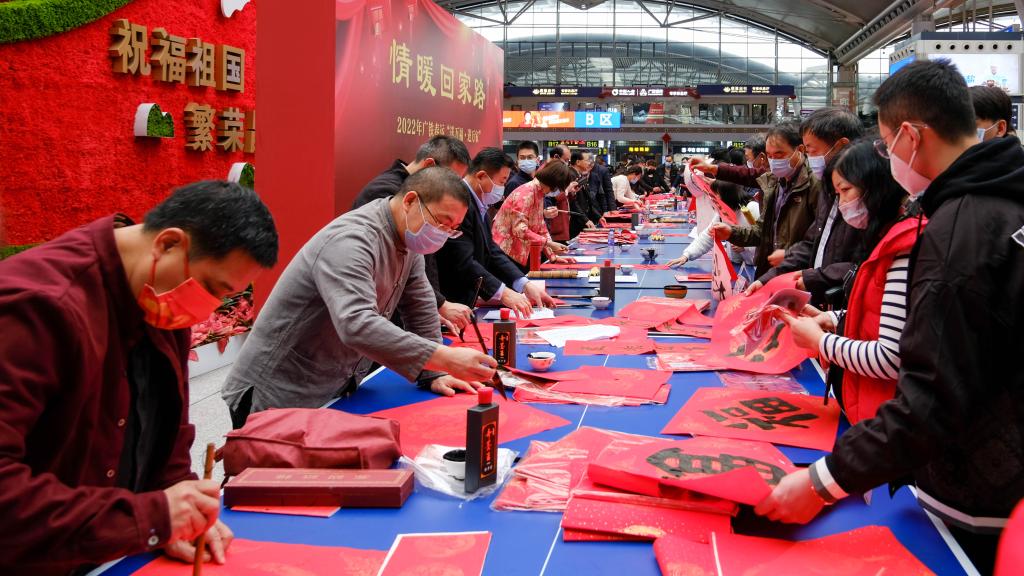 出发站的温馨。17日上午,在广州南站3楼候车大厅中央,十几位来自广铁集团文联和书法协会的书法家、画家的“摊位”前面,挤满了求取春联、福字和画作的旅客,6岁的李和拿着一张“虎年虎画”在父母身边喜笑颜开。春运首日免费为旅客写春联送福字,已成为广州南站的“传统”,一幅幅喜庆的春联透露出一股浓浓的节日温馨气氛。