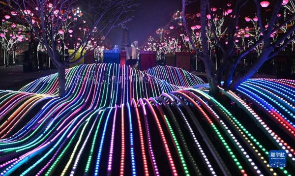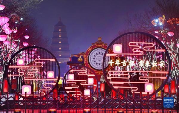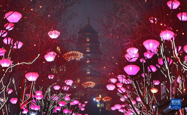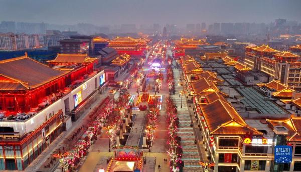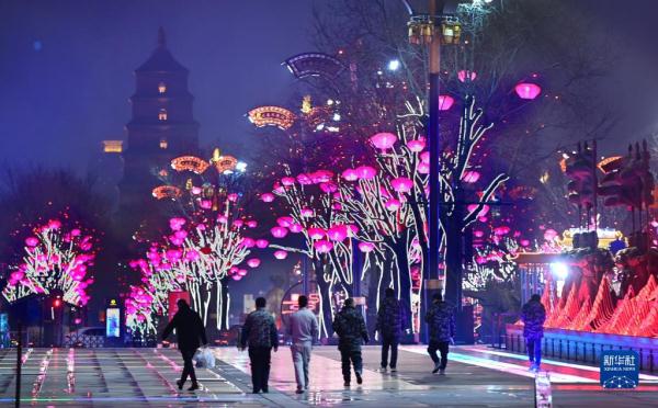 春节临近,西安市大唐不夜城点亮璀璨夺目的灯光,迎接新春佳节的到来。