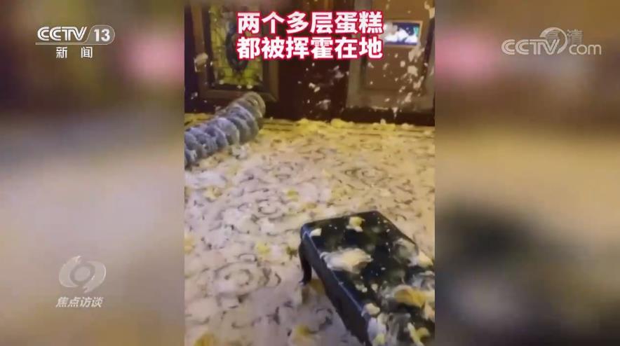 这是发生在多地聚会上的蛋糕大战,从画面上我们可以看到,多层奶油蛋糕被打翻在地,只剩下一个歪歪扭扭的空架子,一群人把蛋糕当作玩具,相互投掷取乐,弄得浑身上下都是奶油蛋糕。由于地面满是奶油,太滑,人甚至无法站立,只能坐在地上。包间内的家具、家电、地毯无一幸免,令在场的工作人员震惊不已。