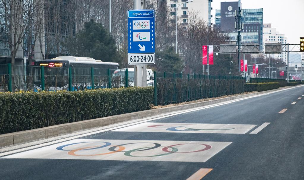 1月21日,北辰东路的奥林匹克专用车道标识。北京市奥林匹克专用车道启用。其中冬奥会启用时间为1月21日至2月25日,冬残奥会启用时间为2月26日至3月16日。新华社记者 肖艺九 摄