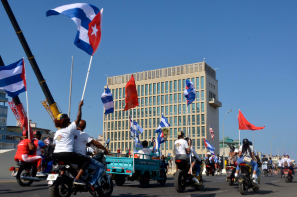 2021年3月28日,参加游行的车队经过位于哈瓦那的美国驻古巴大使馆。新华社发(华金·埃尔南德斯摄)