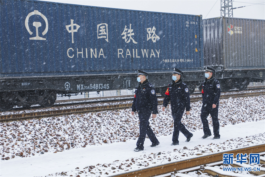 1月21日,河南多地迎来大范围雨雪冰冻天气,为及时确保管内线路安全稳定,洛阳铁路公安处民警顶风冒雪对管内线路进行徒步巡查,排查线路行车设备、站区保留车体、桥隧涵重点部位的安全隐患,为旅客营造良好的春运环境。新华网发(陈国军 摄)