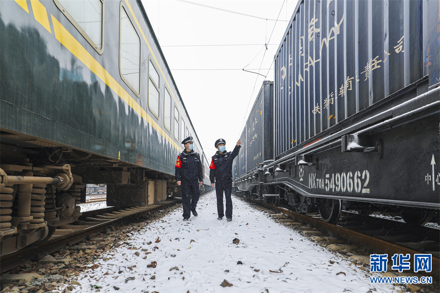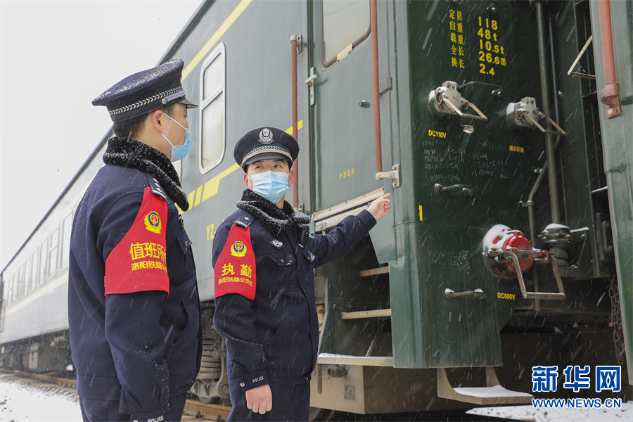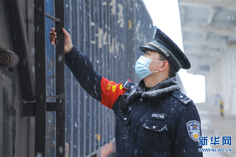 1月21日,河南洛阳,洛阳铁路公安处民警在查看一列停靠的货物列车。
