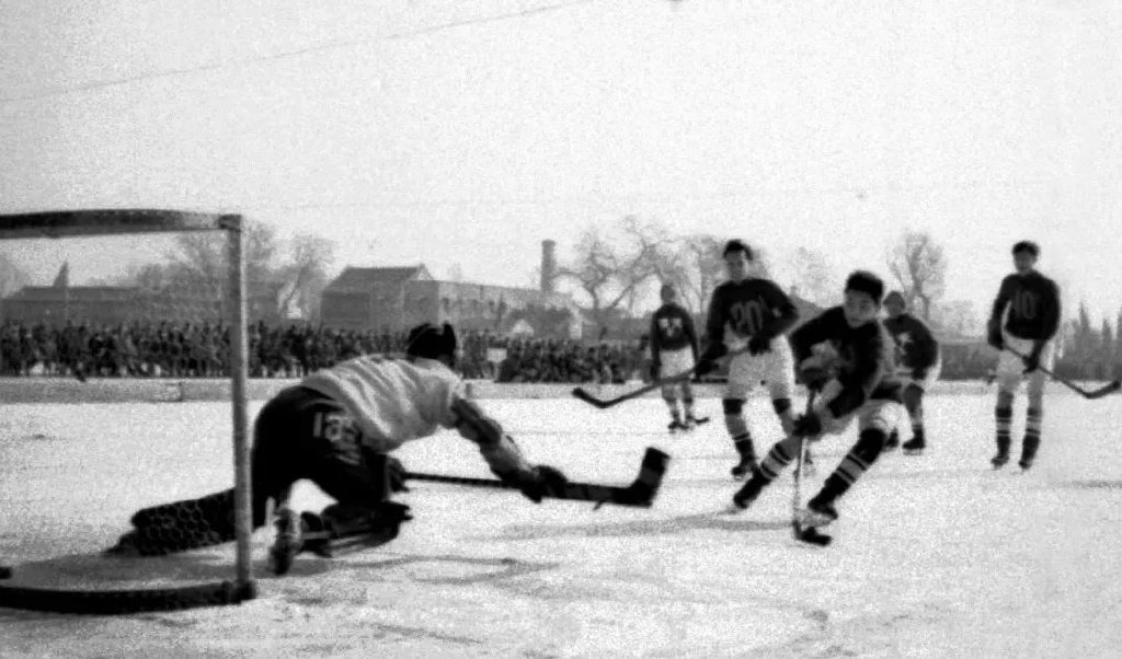 1953年,华北区冰上运动会,北京队与天津队的冰球比赛。(图源:人民画报)
