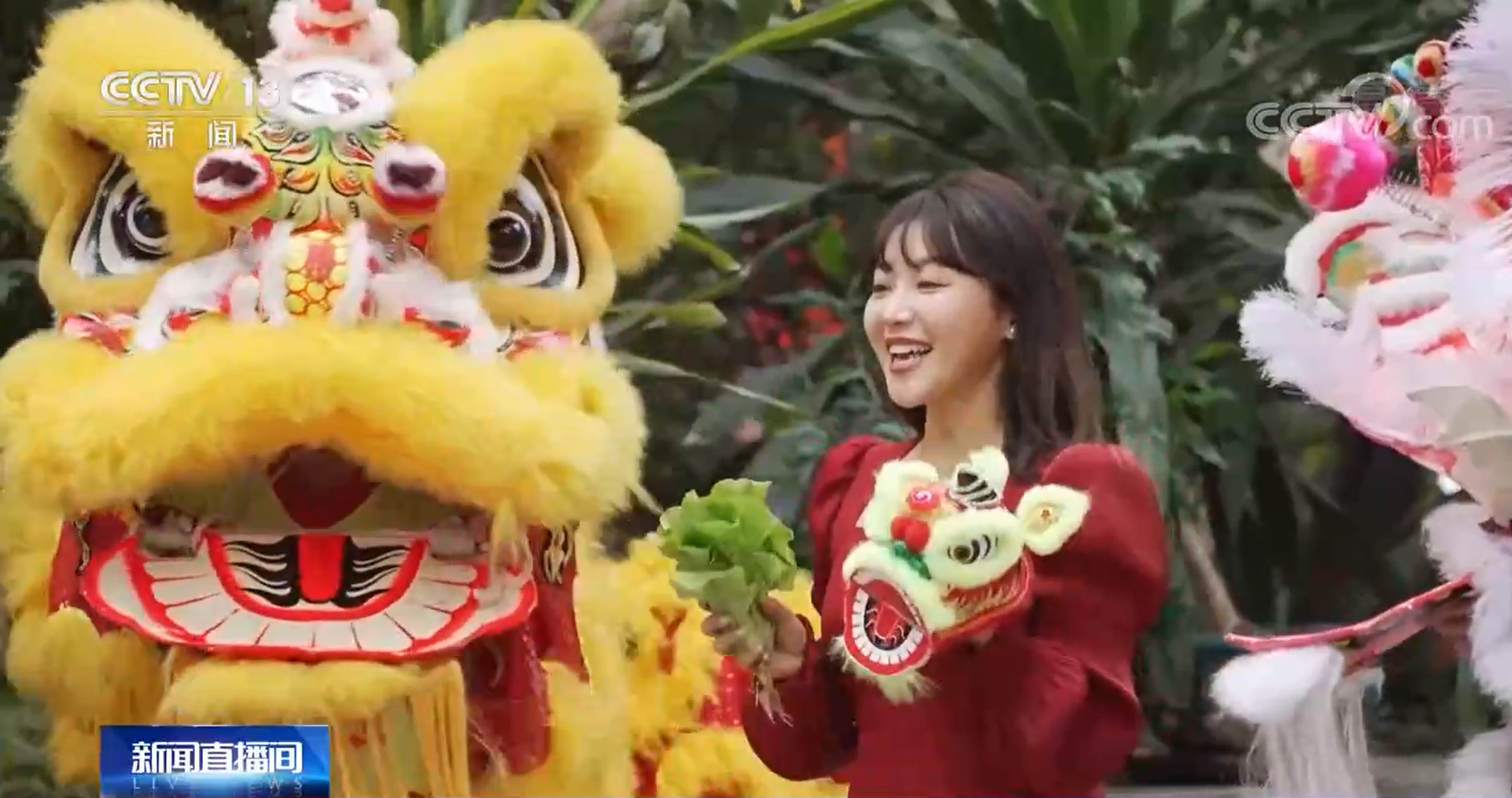 醒狮“采青”,采的就是这棵生菜,生菜谐音“生财”。狮子采了青,再分给街坊,表示把财气、福气分给了大家。在这里,我们也一起祝福观众朋友们身体健康、大展鸿图。