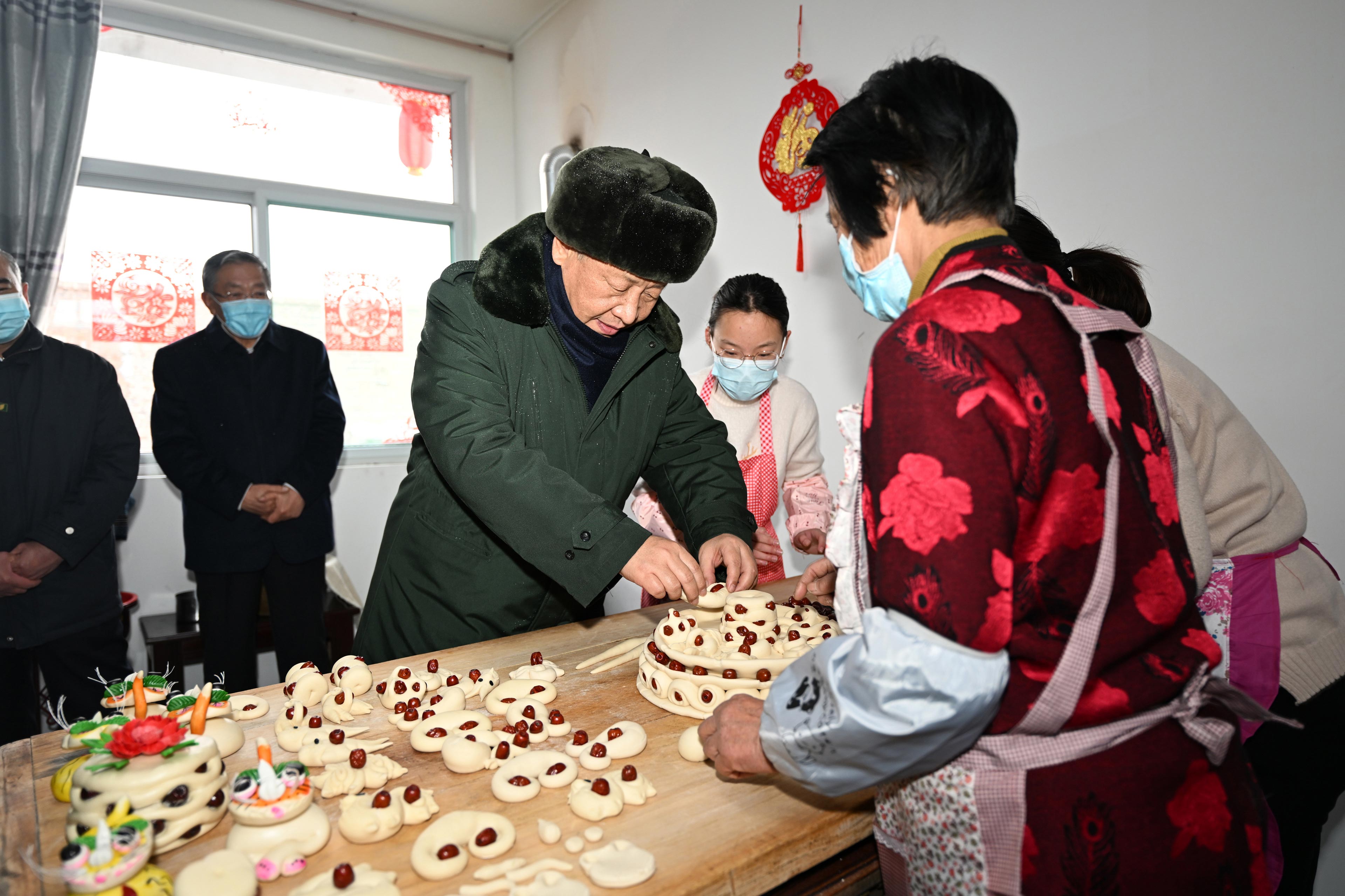 △2022年1月26日,中共中央总书记、国家主席、中央军委主席习近平在临汾市霍州市师庄乡冯南垣村,同师红兵一家做年馍。