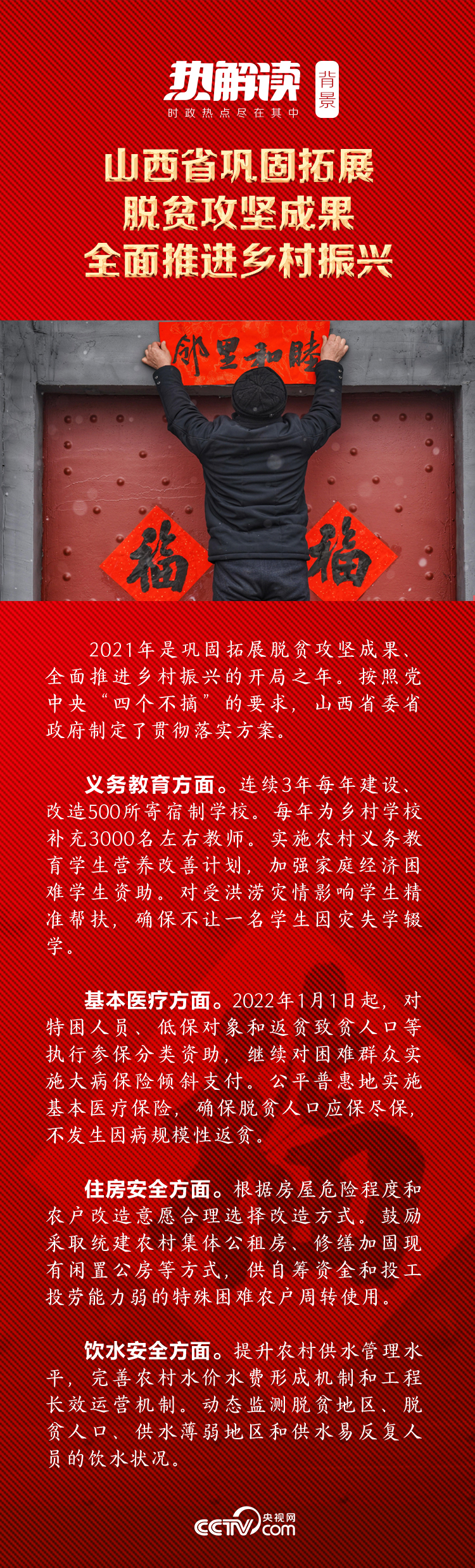 看到乡亲们能够暖暖和和过大年,总书记心里有了底,高兴地对乡亲们说:“一定要把这个年过好!”