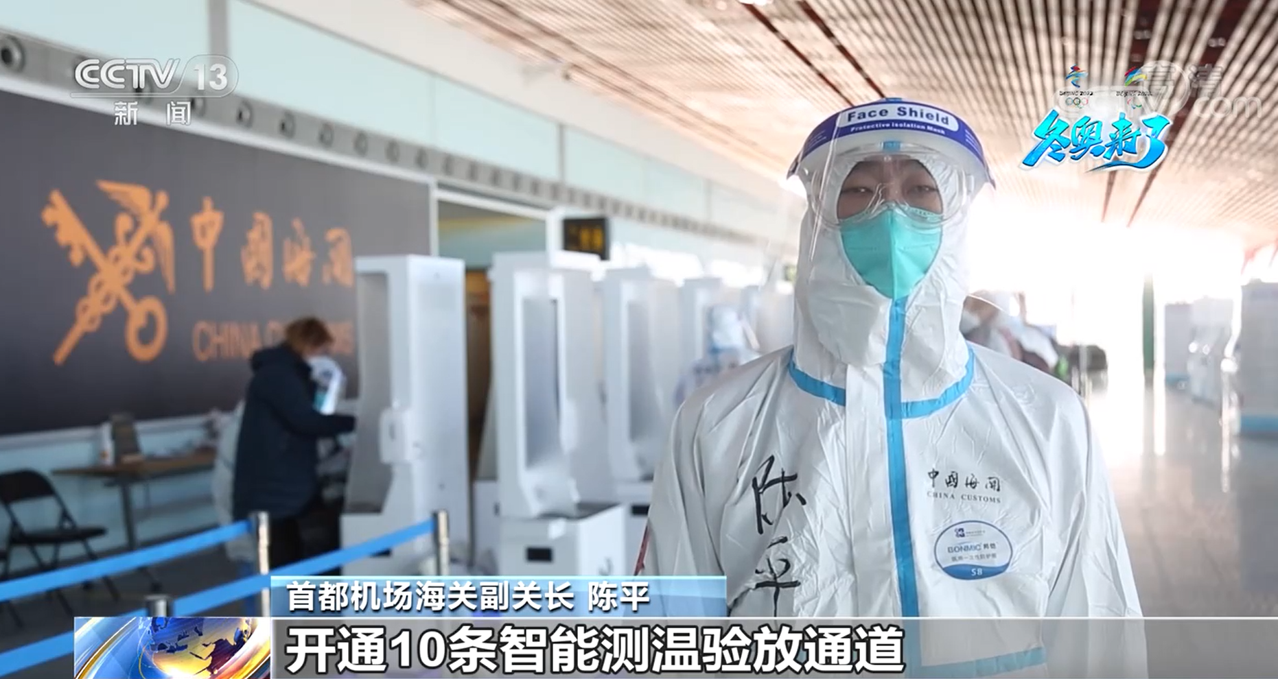 首都机场海关副关长 陈平:我们可以实现12种语言自助健康申报、远程核验、闸机自动放行、测温无感录入等功能,开通10条智能测温验放通道,对所有涉冬奥航班实施“一机一策”,做到严格监管、精准检疫、高效服务。
