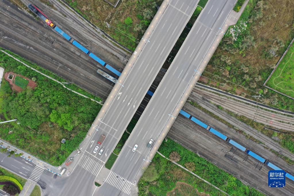 2021年3月19日,中欧班列(渝新欧)十周年纪念专列从重庆一座公路桥下穿过(无人机照片)。新华社记者 唐奕 摄