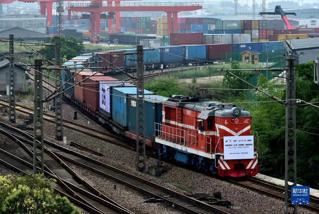 2020年6月5日,满载防疫物资的“义新欧”中欧班列(义乌-马德里)在义乌西站启程,前往西班牙首都马德里。新华社发(吕斌 摄)