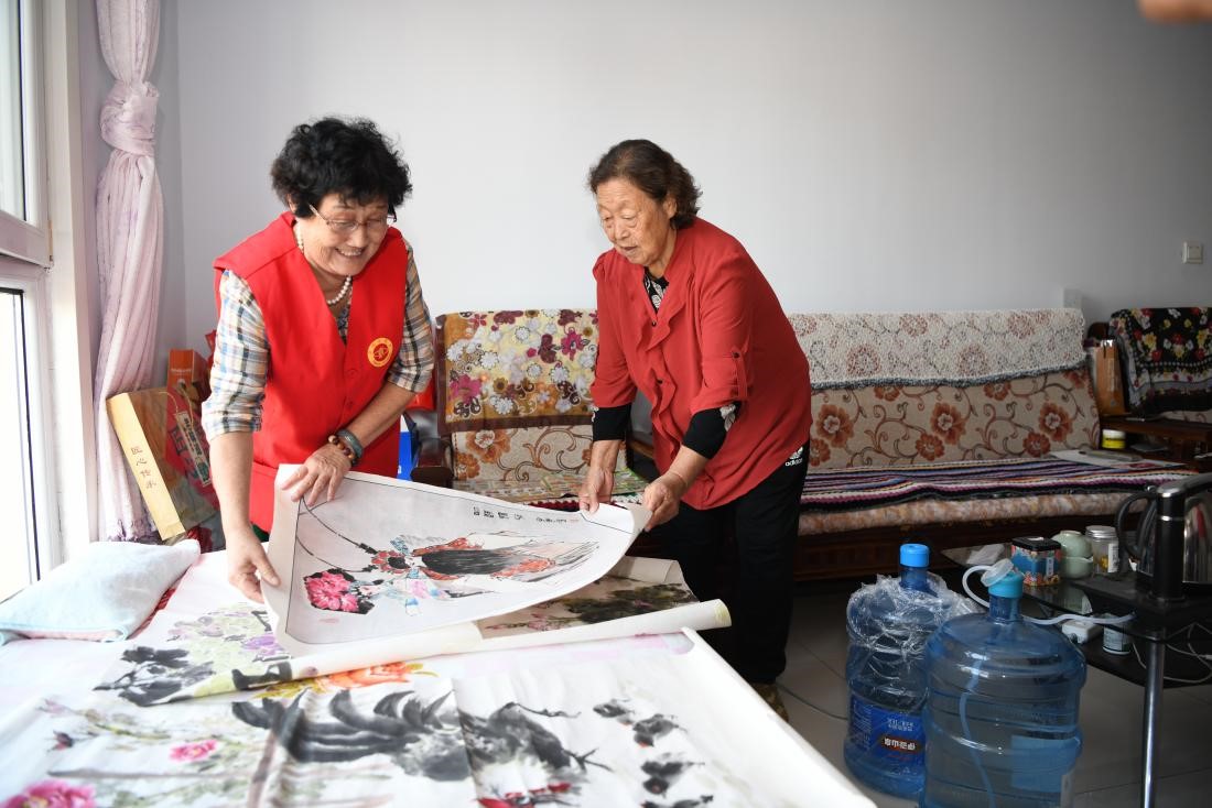 滨河社区志愿者和老人一起欣赏绘画作品。陈琦嘉 摄