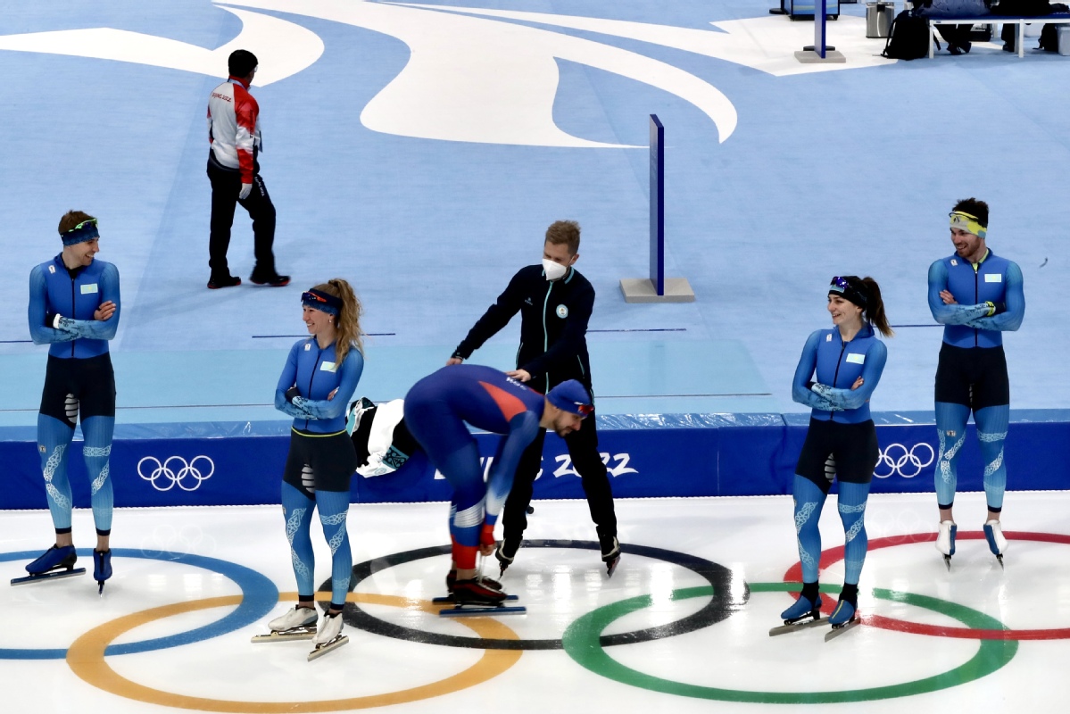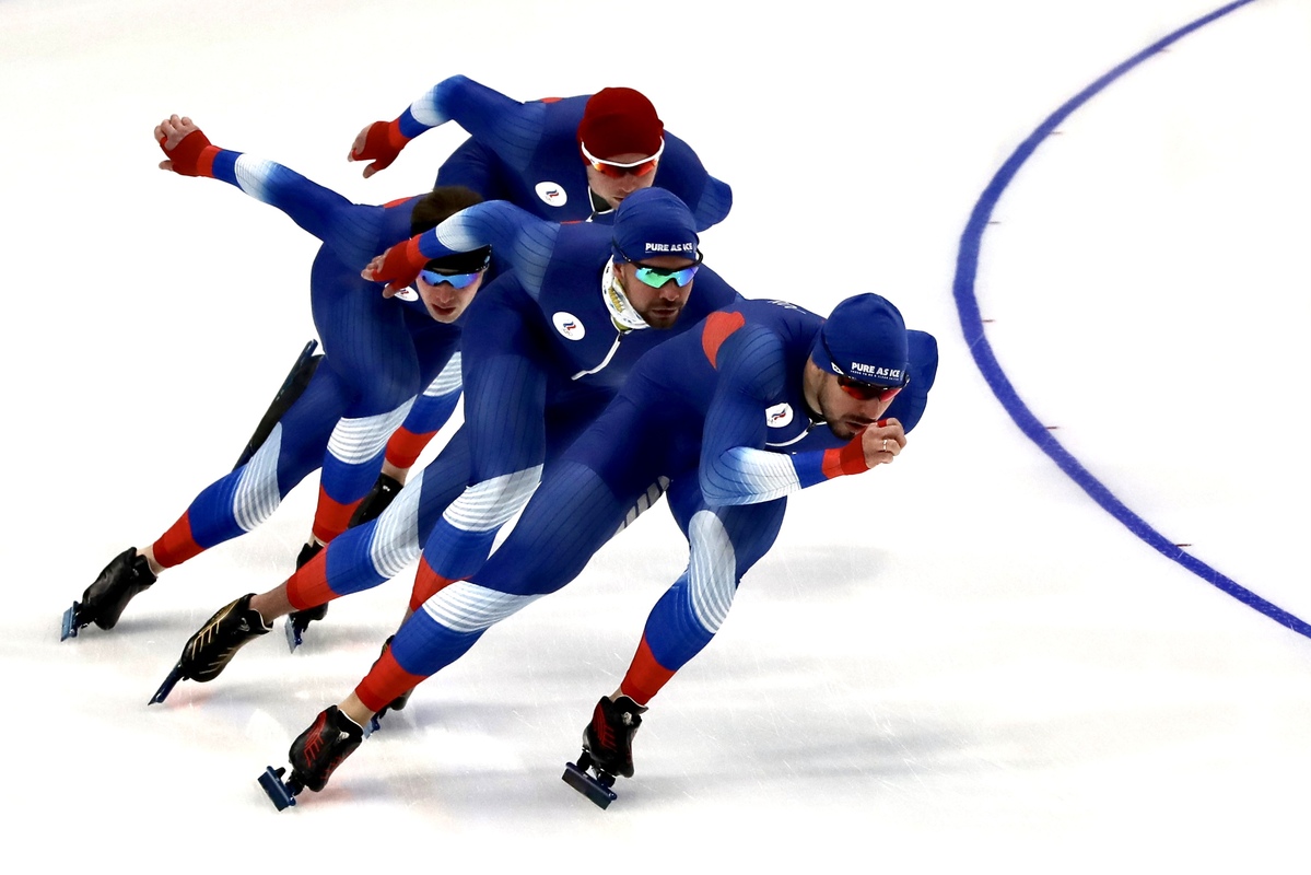 1月30日,在国家速滑馆“冰丝带”,法国运动员在进行赛前训练。 中国日报记者 张威 摄