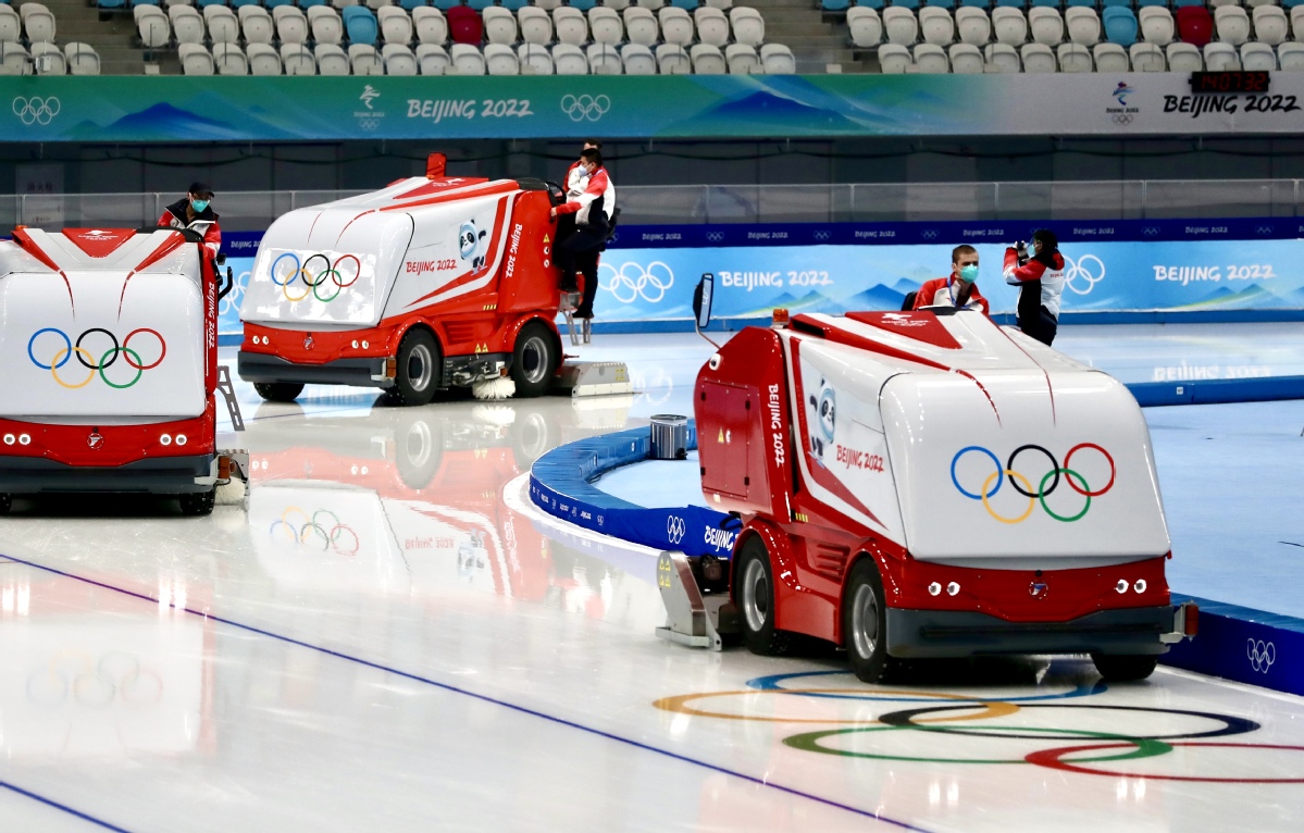 1月30日,在国家速滑馆“冰丝带”,工作人员使用浇冰车及时对冰面进行维护,保障冰面质量。 中国日报记者 张威 摄