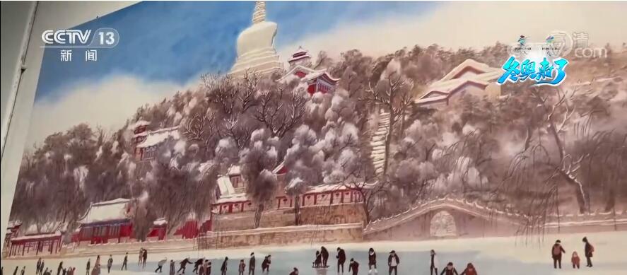 这幅画是在主媒体中心餐厅的入口处,关注度非常高,一看就是画的北海公园,前面的冰面上有很多群众都在参加冰上运动。这幅画创作于2020年,当时表现出了3亿人上冰雪的美好愿望,但是现在看起来,我们这样一个美好愿望已经在冬奥会之前提前实现了。