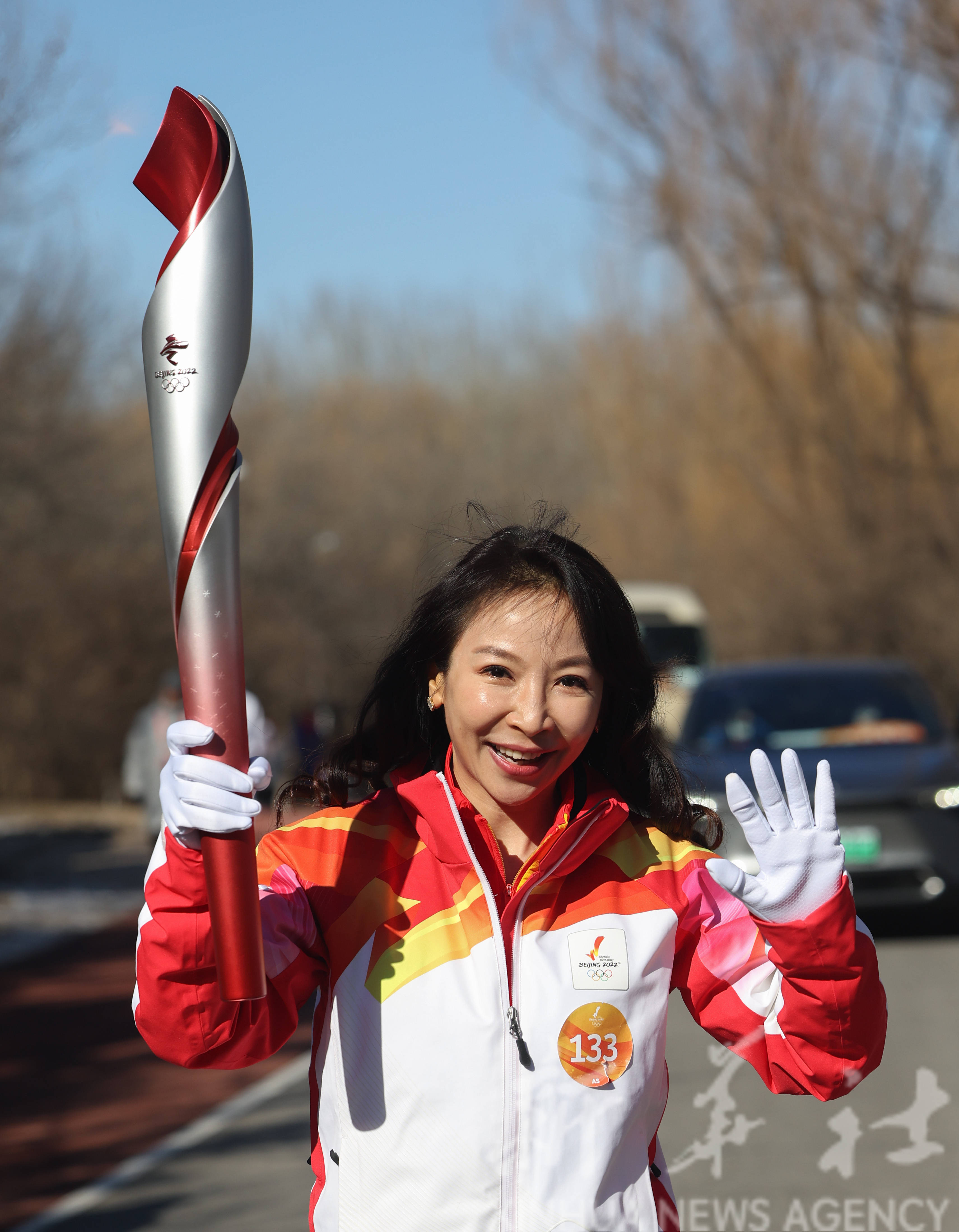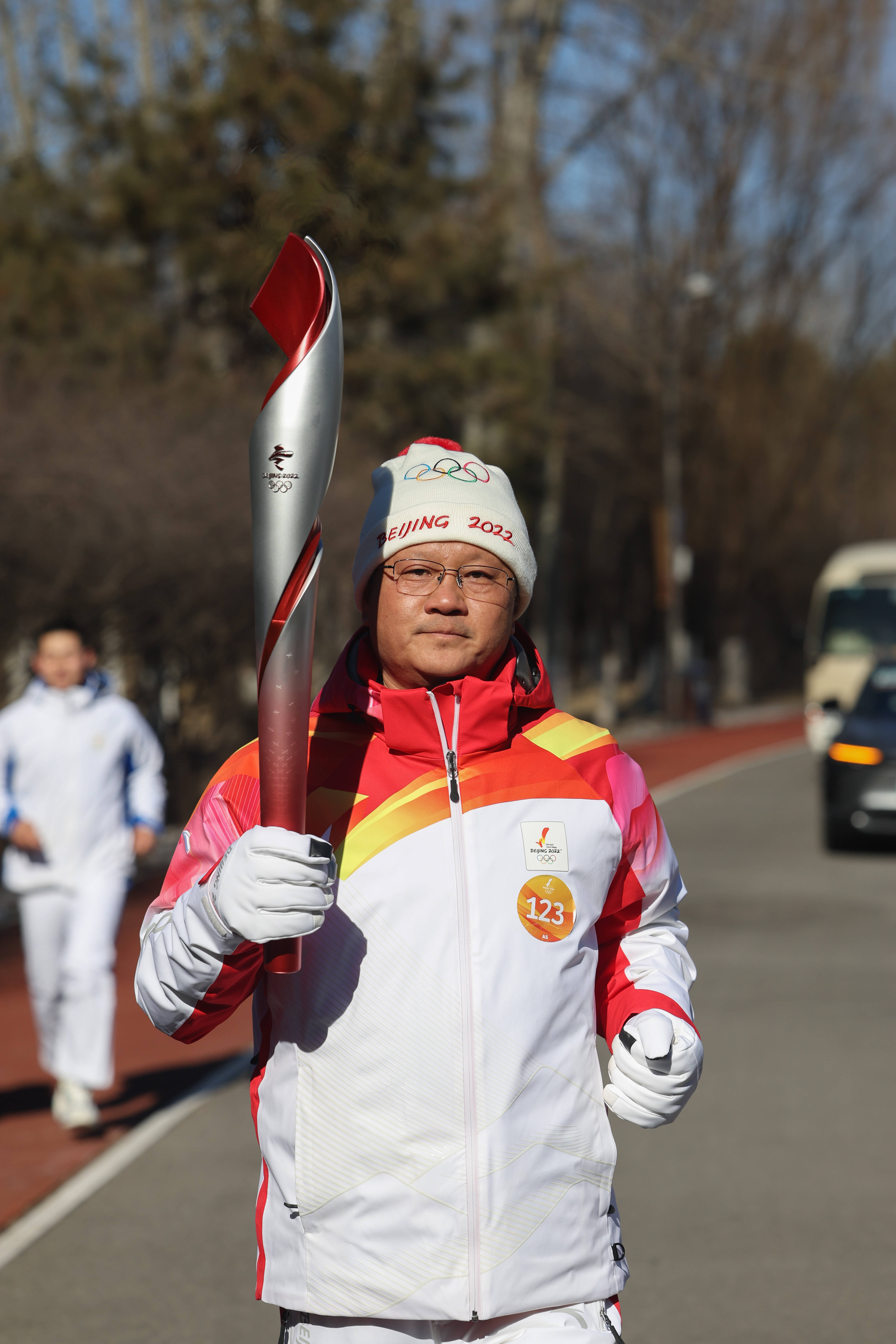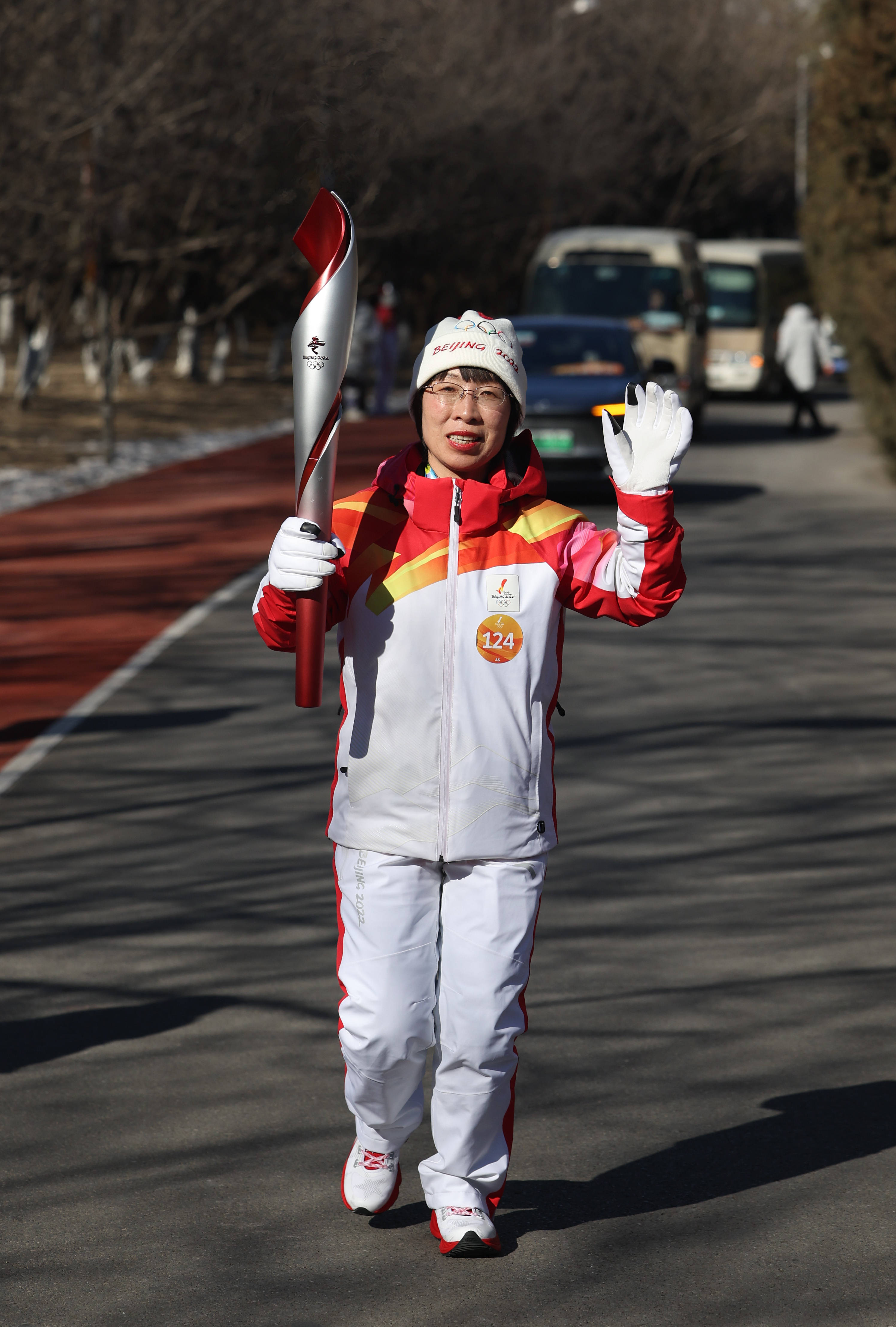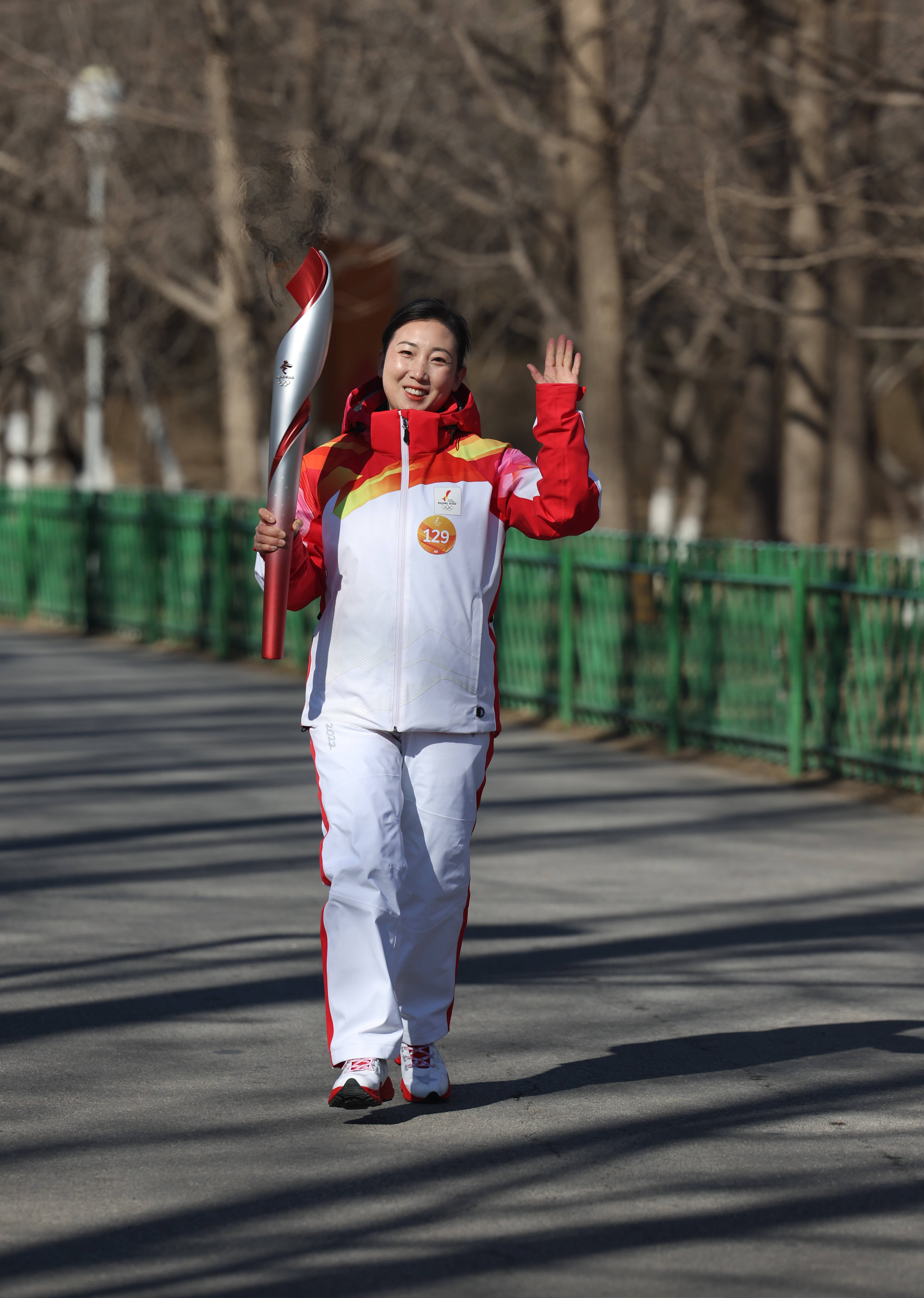 2月2日,火炬手王小节在火炬传递中。