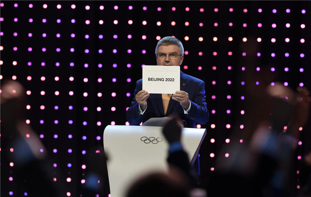 2015年7月31日,国际奥委会主席巴赫在国际奥委会第128次全会上宣布北京携手张家口获得2022年冬奥会举办权。新华社记者 公磊 摄