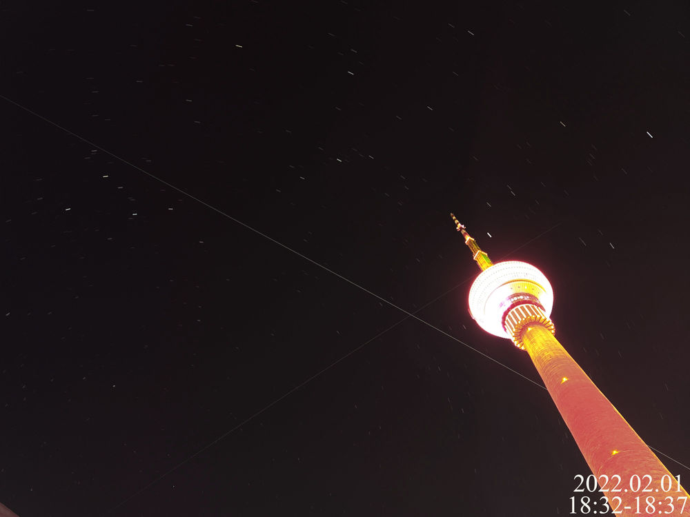 ↑大年初一,中国宫飞越中央广播电视塔。李永刚 摄
