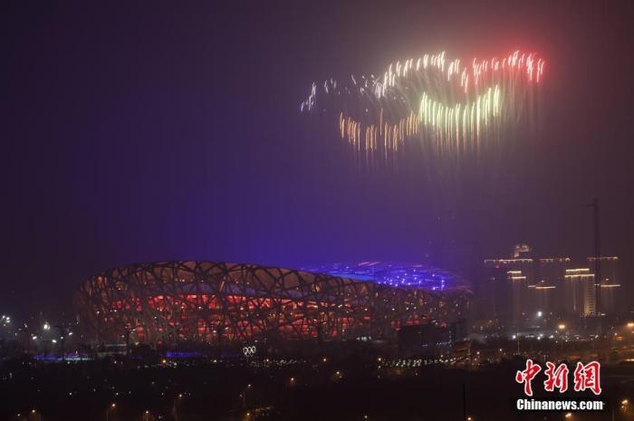 1月30日,北京,2022年北京冬奥会开幕式彩排举行,烟花在鸟巢上空绽放。 图片来源:人民视觉