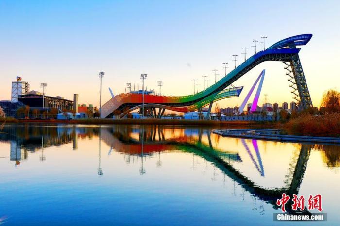 2021年11月12日,北京冬奥公园傍晚景色。北京冬奥公园紧邻首钢园区,滑雪大跳台与首钢大桥交相辉映。 中新社发 牛云岗 摄 图片来源:CNSPHOTO