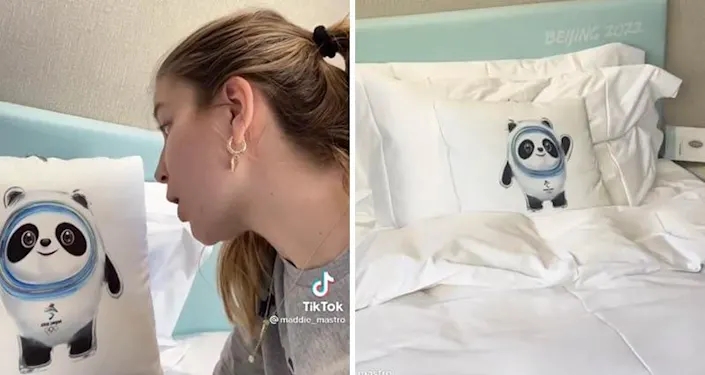 在到达冬奥村的时候,捷克冰舞运动员娜塔莉·塔施莱罗娃(Natalie Taschlerova)收到了各种礼物和纪念品。在看到冬奥会吉祥物的时候,她更是激动不已。“我看到吉祥物的时候激动得快哭出来了。”塔施莱罗娃说,她和队友还一直在商量要买 “冰墩墩”的钥匙链和枕头,因为实在太可爱了。