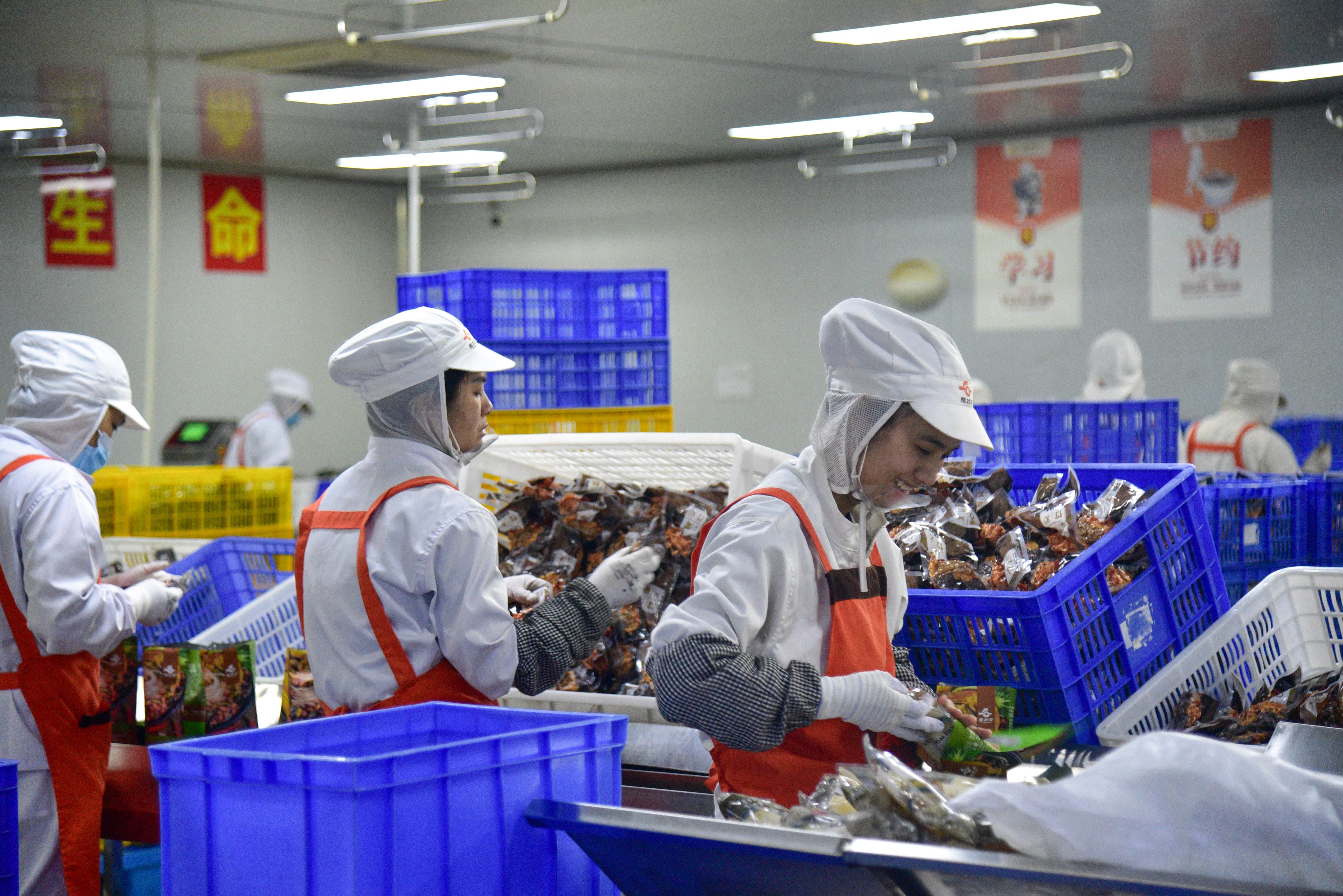 △ 广西柳州,工人在螺蛳粉生产车间生产线上包装袋装螺蛳粉。