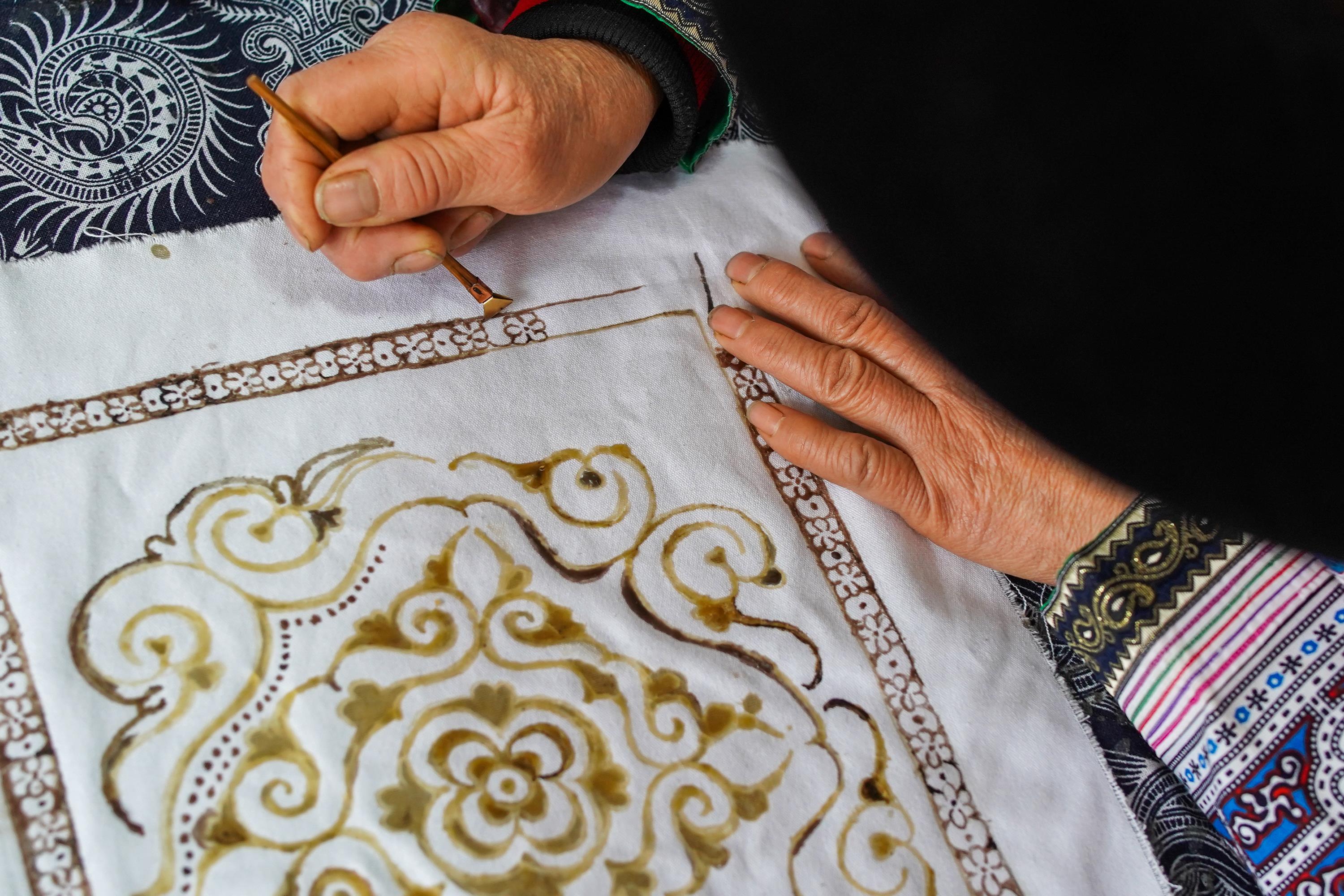 △ 贵州新仁苗族乡化屋村,村民在苗绣车间制作蜡染。
