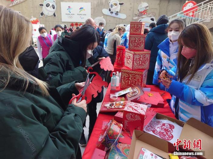 1月31日,适逢中国农历牛年岁末除夕,北京冬奥会主媒体中心的各国媒体记者也感受到了浓浓的中国年味道。图为中国传统剪纸艺术吸引外国媒体记者一试身手。 中新社记者 毛建军 摄