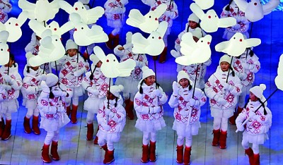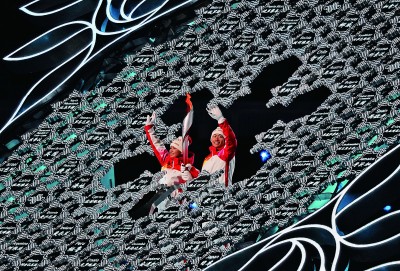 这一刻,奥林匹克格言“更快、更高、更强——更团结”被流光溢彩地“绘就”在“鸟巢”的地面上,6位中国冬季项目传奇运动员护送着奥林匹克会旗走进场地。他们走过之处,寓意着团结吉祥的“中国结”优雅飘动。