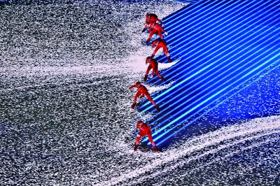 一滴冰蓝色的水墨从天而降,幻化为黄河之水,倾泻而下。翻腾的浪涛,最终凝结为一片晶莹剔透的冰雪天地。一方巨大的水从冰面中升起,凝固成冰。过往23届冬奥举办城市的历史,随着环绕全场的24道“激光刻刀”的雕琢,闪回其上,最终定格为“2022中国北京”。