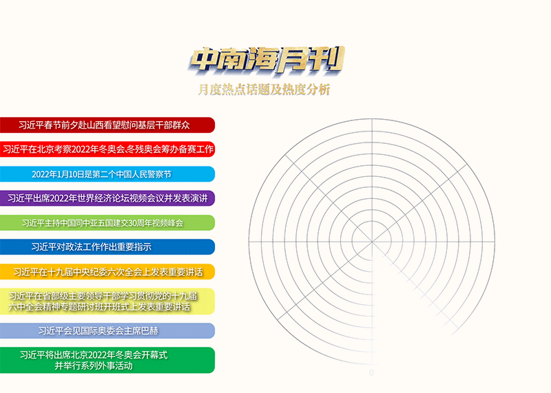 央视网“智闻”系统提取分析2022年1月时政热点新闻,总书记两赴地方考察、出席2022年世界经济论坛视频会议、主持中国同中亚五国建交30周年视频峰会等相关话题备受关注。
